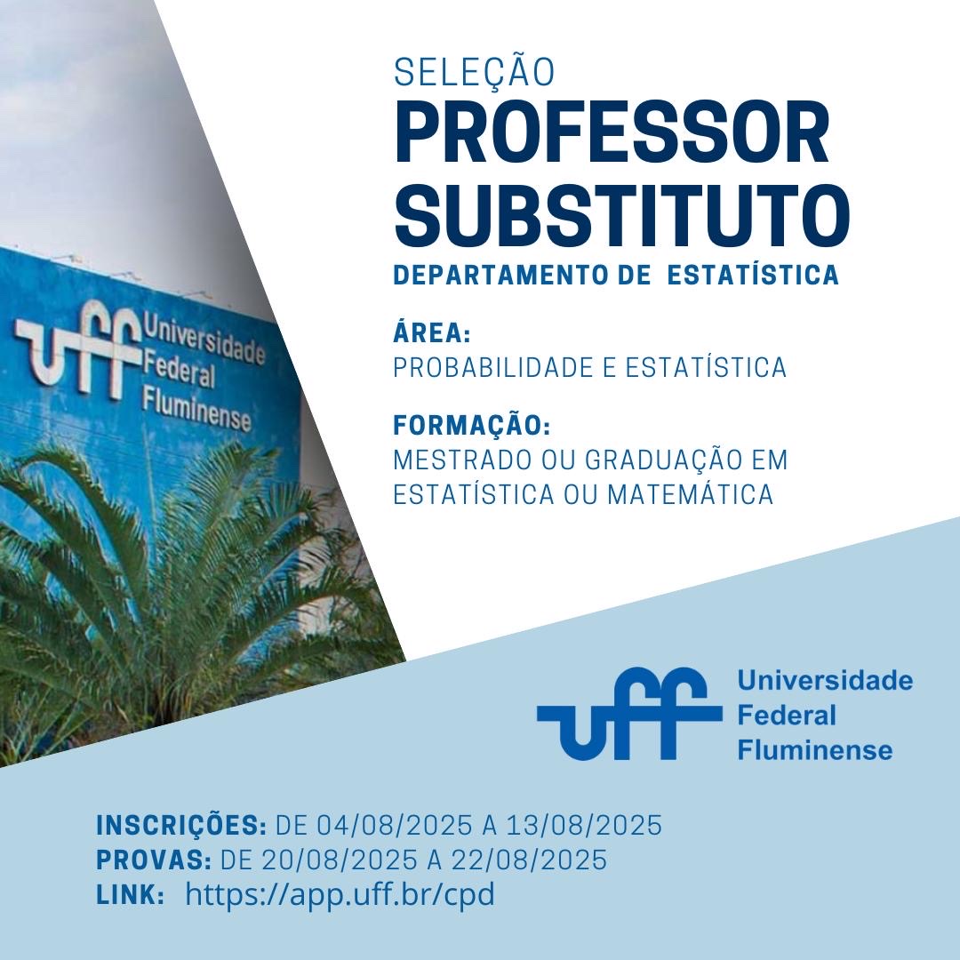O Departamento de Estatística da UFF está com uma seleção simplificada aberta para professor substituto sob regime de trabalho de 40 horas semanais.