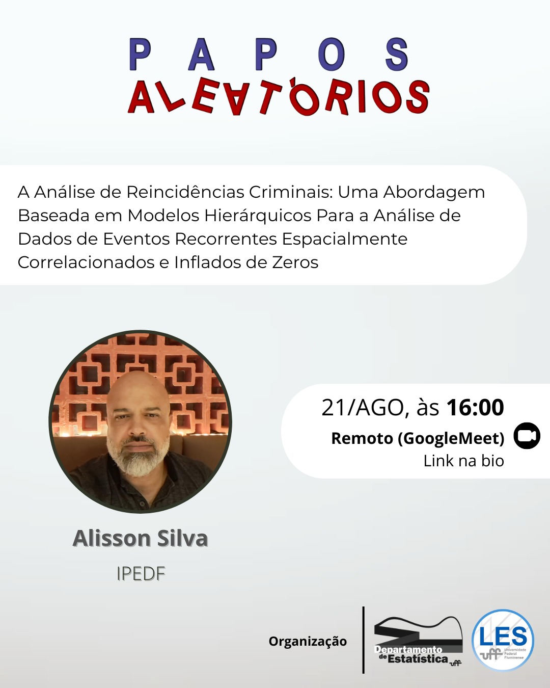 Instituto de Pesquisa e Estatística do Distrito Federal (IPEDF). A palestra irá começar com uma apresentação do Programa de Pós-graduação em Estatística da UFMG pelo Prof. Marcos Prates e logo em seguida o Dr. Alisson C C Silva irá apresentar o trabalho A Análise de Reincidências Criminais: Uma Abordagem Baseada em Modelos Hierárquicos Para a Análise de Dados de Eventos Recorrentes Espacialmente Correlacionados e Inflados de Zeros.